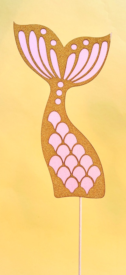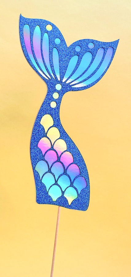 Material: Glitzer-Kraftpapier. Dünner Holzspieß wird hinten angeklebt.