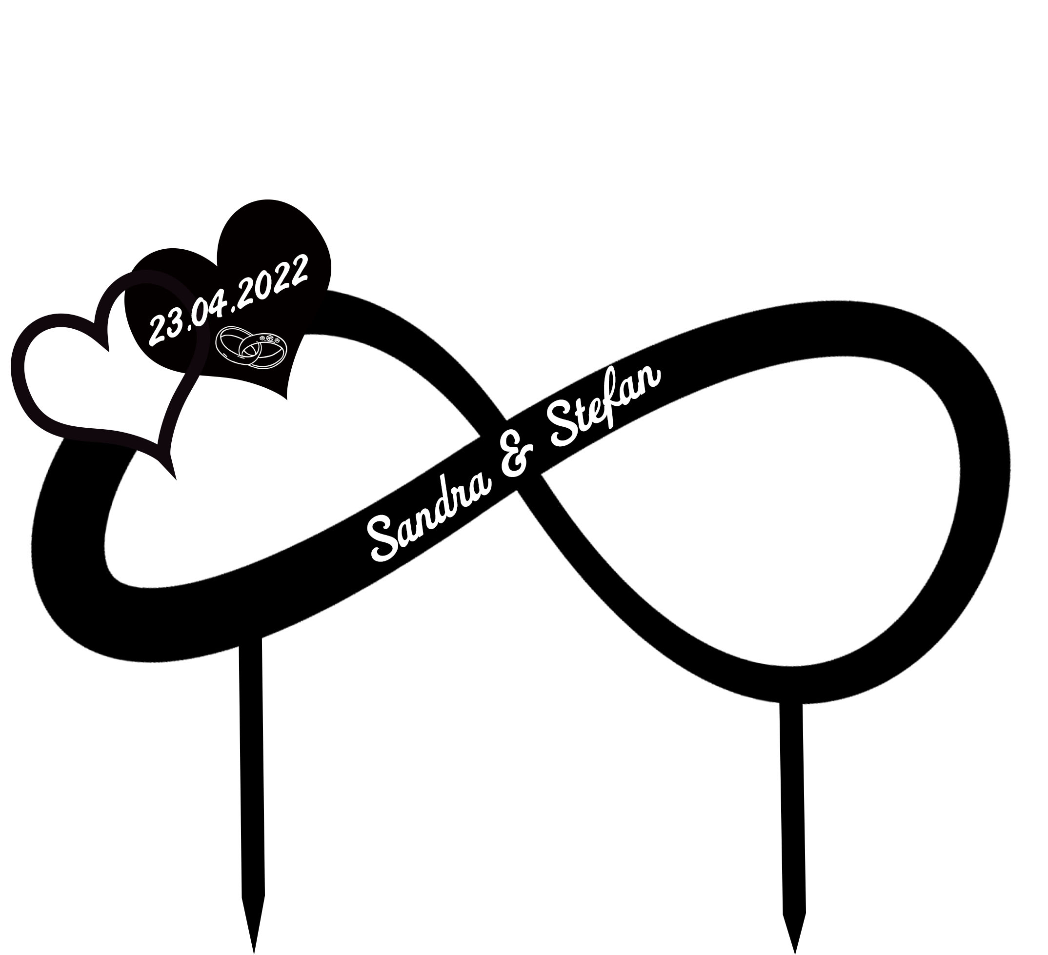 Wir machen dir deinen persönlichen Kuchen Topper. Der Topper zeigt die gewünschten Namen und ein Doppelherz. Ideal für Hochzeitstorten oder für Jubiläen.