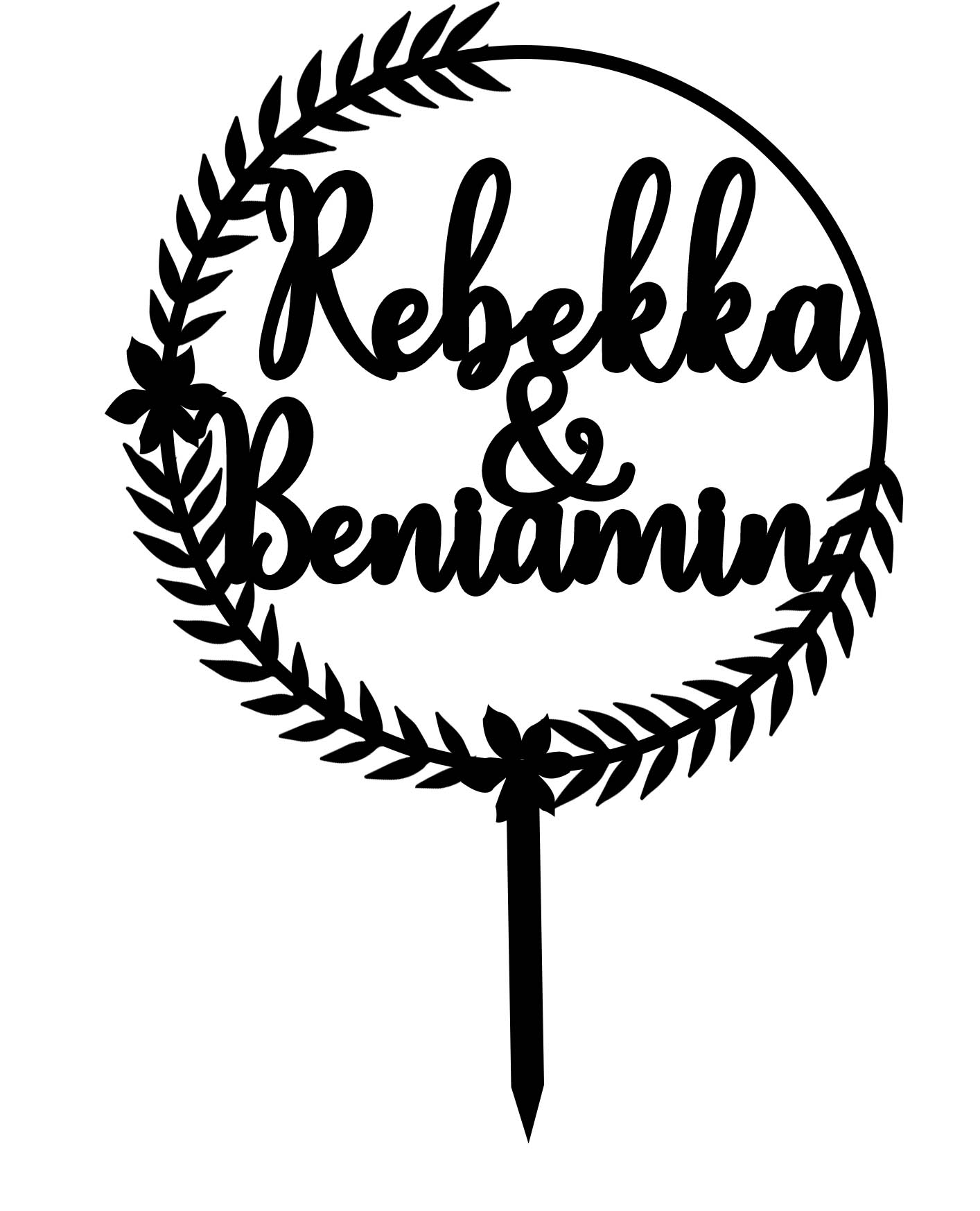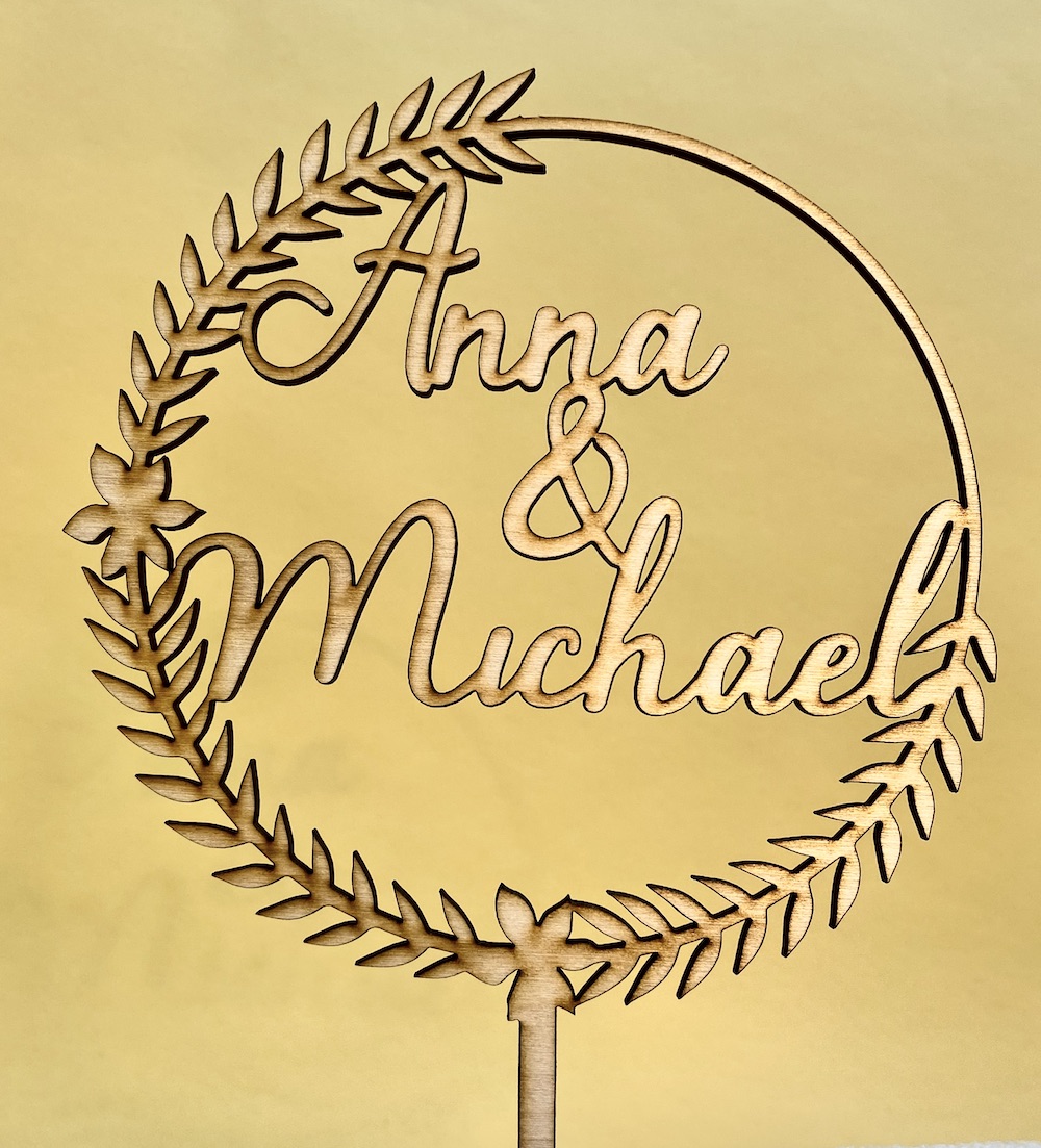 Wir machen dir deinen persönlichen Kuchen Topper. Der Topper zeigt deinen Wunschtext im Blätterkranz. Ideal für Hochzeitstorten oder für Jubiläen.