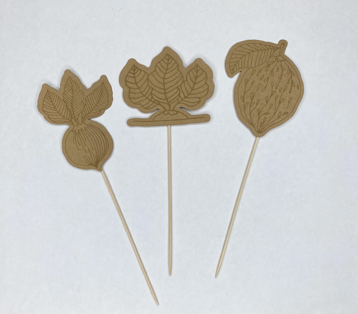 - Holzpappe 2mm stark. Sieht wie ein Laubsägeholz aus, ist aber ein Karton. Dünner Holzspieß wird hinten angeklebt.
